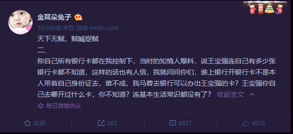 马蓉连发多条微博“控诉”王宝强,她称:“自己所有银行卡都在我控制下,当时的知情人爆料,说王宝强连自己有多少张银行卡都不知道,这样的话也有人信,我就问问你们,谁上银行开银行卡不是本人带着自己身份证去,难不成,我马蓉去银行可以办出王宝强的卡?王宝强你自己去哪开过什么卡,你不知道?连基本生活常识都没有了?”
