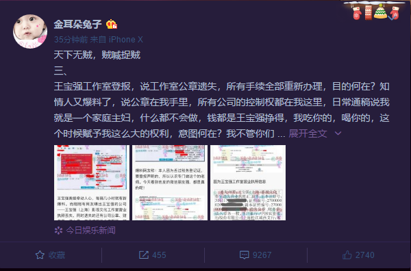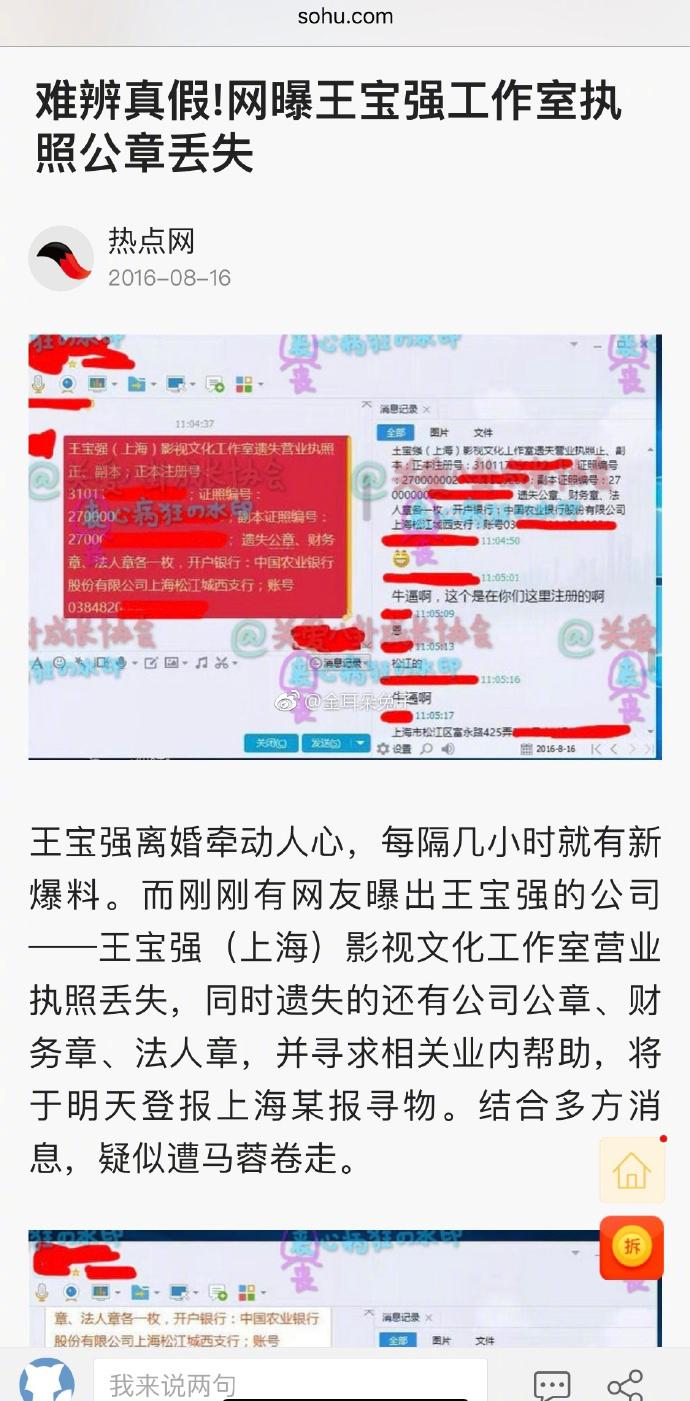 马蓉连发多条“天下无贼,贼喊捉贼”的微博,在第三条中她称:王宝强工作室登报,说工作室公章遗失,所有手续全部重新办理,目的何在?知情人又爆料了,说公章在我手里,所有公司的控制权都在我这里,日常通稿说我就是一个家庭主妇,什么都不会做,钱都是王宝强挣得,我吃你的,喝你的,这个时候赋予我这么大的权利,意图何在?我不管你们打算陷害我什么,你的东西我没碰过!从银行流水可以看出,工作室所有的东西一直在王宝强控制下,并且频繁的与王宝强个人账户有往来!