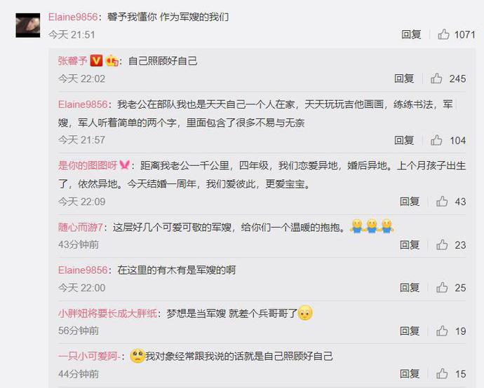 张馨予的这条微博也引发了很多同为军嫂的网友感慨。有网友留言称:“馨予我懂你 作为军嫂的我们”“我老公在部队我也是天天自己一个人在家,天天玩玩吉他画画,练练书法,军嫂,军人听着简单的两个字,里面包含了很多不易与无奈”