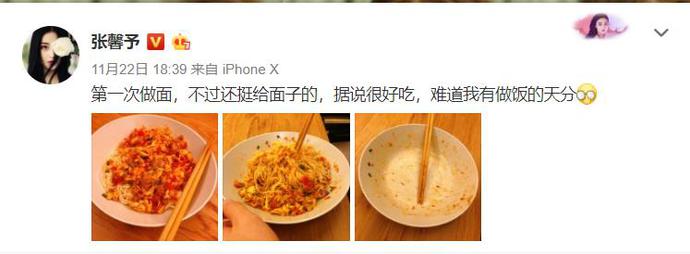 如今张馨予的生活还是挺佛系的,翻看她的微博发现大部分动态都是晒各种美食,看来已经成贤妻良母了。还记得夫妻俩上一次秀恩爱,还是张馨予第一次给何捷做面,而何捷也很给面子的全部吃完了。
