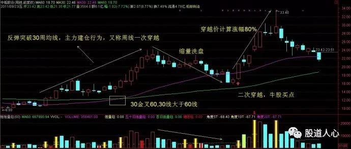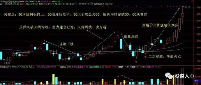 关键点:30周线开始拐头向上,60周线至少已经开始走平,已经拐头向上更佳;30周线金叉60周线,或者30周线大于60周线,从而形成周多均线开始向上发散,股价二次穿越时一举突破30、60周线更有爆发力。
