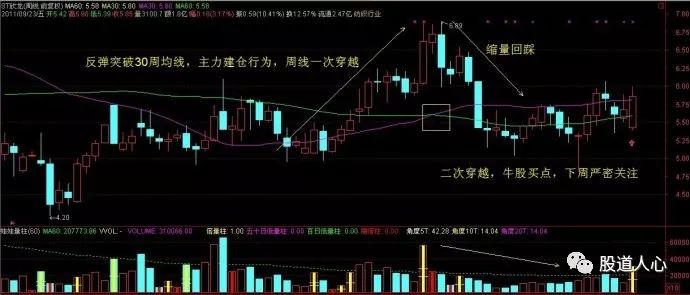 周线二次穿越买牛股:当股价(周线图)经历了一段下跌之后,反弹起来突破30周均线位时,我们称之为"周线一次穿越",不过,此时往往只是庄家在建仓而已,我们不应参与而应保持观望,等待缩量回踩的过称完成。当股价(周线图)再次突破30周均线时,我们称为"周线二次穿越",这意味着庄家洗盘结束,即将进入拉升期,后市将出现较大的升幅。此时可密切注意该股的动向,一旦其日线系统发出买入的信号,即可大胆跟进。