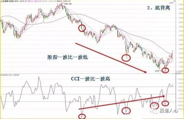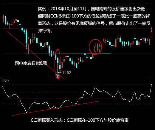 CCI 的底背离一般是出现在远离—100线以下的低位区。当K线图上的股价一路下跌,形成一波比一波低的走势,而CCI曲线在低位却率先止跌企稳,并形成一底比 一底高的走势,这就是底背离。底背离现象一般预示着股价短期内可能将反弹,是短期买入的信号。(注意与MACD、KDJ等指标的背离现象研判一样,CCI 的背离中,顶背离的研判准确性要高于底背离。底背离走势出现的越多,准确性就越高!)