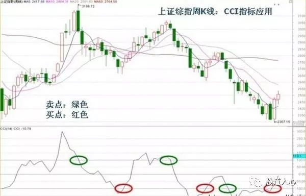 我们来看看下图如何用CCI指标进行判断买卖点,图中绿色标记为卖点,红色标记为买点。当CCI指标下穿+100跌破超买区域就是我们需要出货的时候,CCI上穿-100突破超买区域就是我们介入的时机。