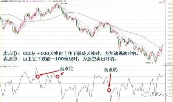2、股价出现小幅上扬,CCI向上突破+100不久,又一度反转向下突破+100,(或不破天线或在天线附近对此状况走势)五日至十个交易日左右;