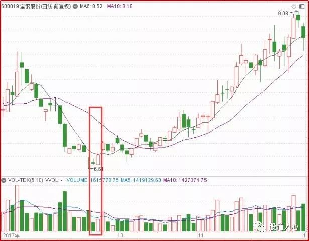 上图是宝钢股份2017年10月前后的走势。经过一轮上涨以后,9月份宝钢股份股价出现明显的大幅回调,9月26日宝钢股份出现了低位阳包阴的走势,股价走势随即反转,持续上涨了近2个月,涨幅接近40%。