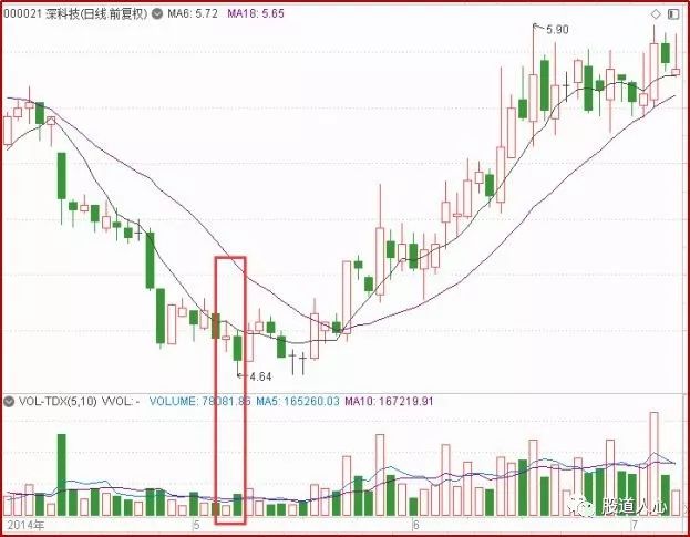 上图是深科技2014年5月前后的走势,出现阴包阳的走势后,股价就反转了,而且是中长期的趋势性反转。