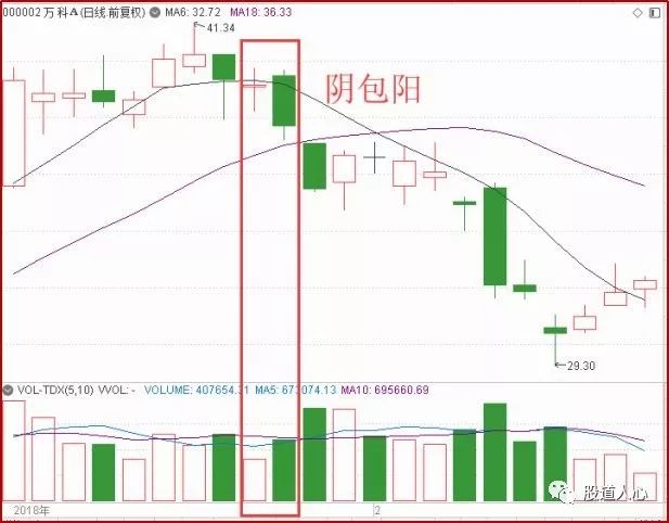 上面就是万科A在1月份股价见顶前后一种K线走势。1月29日万科A出现了阴包阳的走势,可以明显的看到阴线是放量的。阴包阳形成以后,1月30日万科A就出现了跳空1.5%下跌的走势。