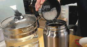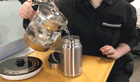 ▶ 将焖烧杯中用来预热的水倒干,再次加入100℃的沸水到最高水位的标志线,这样能最大程度的给食材加温、保温!