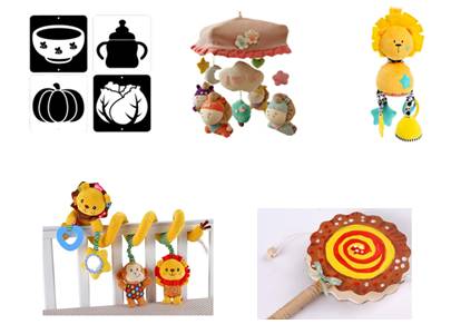 适合玩具:黑白卡、音乐床铃、悬挂玩具、床绕、拨浪鼓