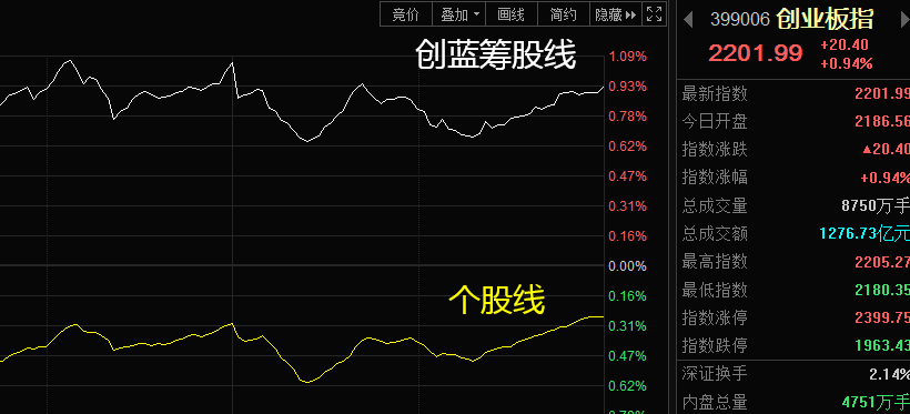 创蓝筹股上涨0.93%(白线),个股下跌-0.3%(黄色线),是不是分歧更大啊!既然今天有分歧,所以整个股市的人气效应,就差了!