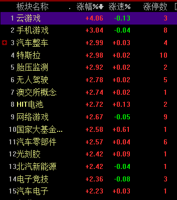 盘面热点方向,盘面持续有结构性热点,今天主要拉升的是汽车股、游戏股等,都是消息政策刺激的,券商大金融也有所异动,把握的住结构性行情的朋友可以适当仓位去把握!大风险都可控!但不要乱追,像消费,消费电子等都是反复热点!