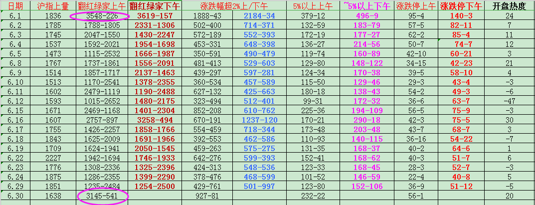 五穷六绝七翻身,最难熬的6月都度过了,好好把握7月行情!短期若无新热点,现在处于7月半年报披露阶段,低位的业绩好的可能会更加受到资金青睐哦!注意市场无量不要乱追高!