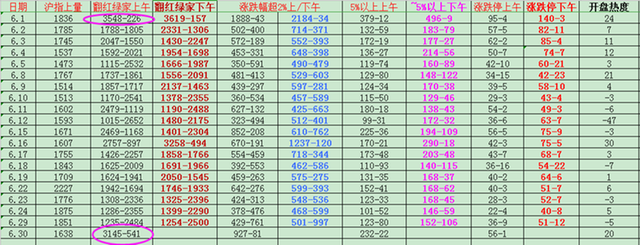 (2)涨跌(震荡小跌):从今天上午的个股数据来看,涨停56家,跌停1家;涨跌幅超2%的对比是927比81,红绿比3145:541,这数据是近20个交易日来最好的一天,上一次是6.1日!可见5穷6绝7翻身里的6绝有多难!好好去把握7翻身行情吧!