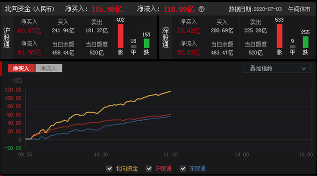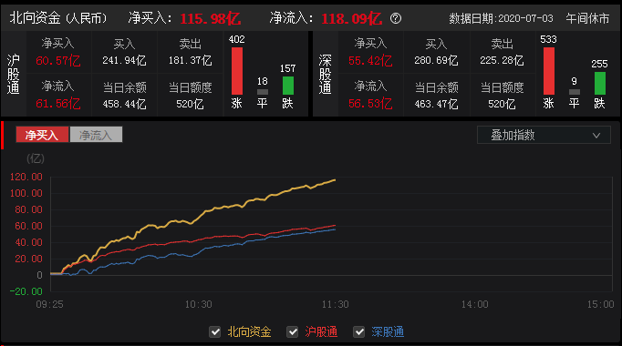 (3)外资:外资净买入沪市60.57亿,净买入深市55.42亿,两市合计净流入115.98亿;外资在休息两日后大买特买,看好行情,外资的净流入和净流出对股市明显的影响作用,因为很多人把外资当做聪明资金,在抄底和逃顶时都会参考!