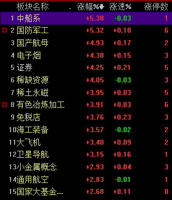 领涨热点:周期股(军工、有色、券商、钢铁、煤炭)