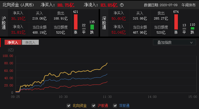 (3)外资:外资净买入沪市30.15亿,净买入深市50.6亿,两市合计净流入80.75亿;外资前天成交总额达近2000亿,外资的净流入和净流出对股市明显的影响作用,因为很多人把外资当做聪明资金,在抄底和逃顶时都会参考!