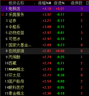 板块:前期老热点免税点回流,证券保险等是推动大盘指数强势上行的方向,剩下的板块雨露均沾都在反弹,修复还不错,科技股也在拉升,今日可喜可贺的是盘面没有多少大跌的个股!