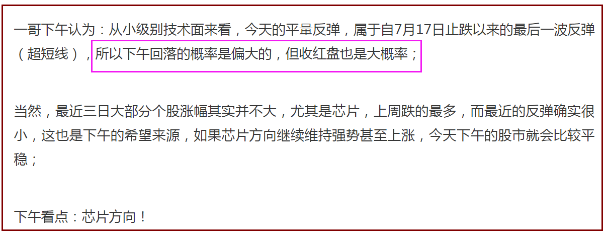 上图是今天午间股评研判内容,下午回回落,但会红盘,大家对照下大盘的走势,一模一样,厉害吧!