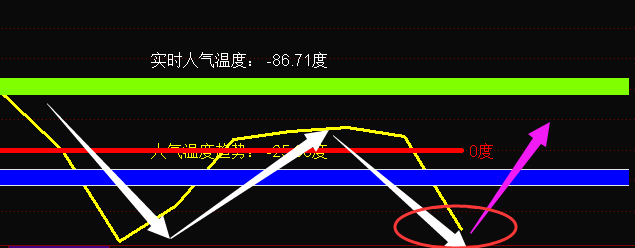 人气温度趋势:人气温度趋势线,-26度;昨天独倾还在讲,人气温度趋势线少一次二次探底,今天就给了!下周股市很容易反弹,看下图: