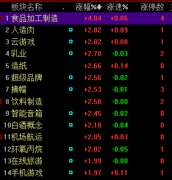 领涨热点:造纸、旅游、消费电子、食品、酿酒等;
