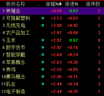 版块:上周强势的白酒板块,今天表现一般。消费电子--苹果概念持续上周五的走势,继续领涨;同时农业、数字货币再次上涨,持续性不高,但是经常炒作;今天养鸡、赛马等板块涨幅也不小。