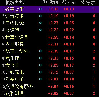板块:数字货币是今天最大的热点,整个板块38只个股,37家红盘,力度非常强;白酒、饮料、券商等大蓝筹领涨;军工分支大飞机概念股涨势居前,消费电子再次异动。