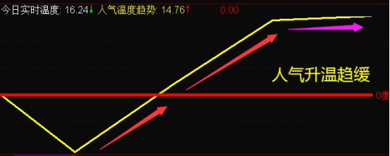 --温度计:人气温度趋势线,上升角度放缓,短线调整开始了;当然还没有跌破0度,这波反弹行情就还未结束。