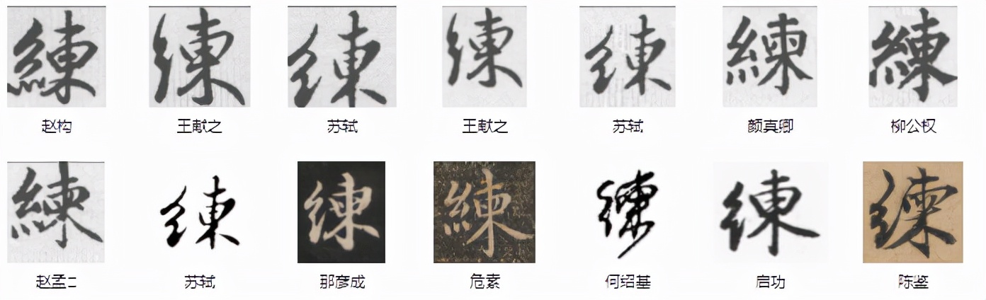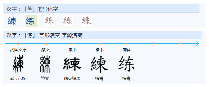 繁体字“練”简化为“练”是根据古人(异体字、同旁字)书法省笔规范简化。