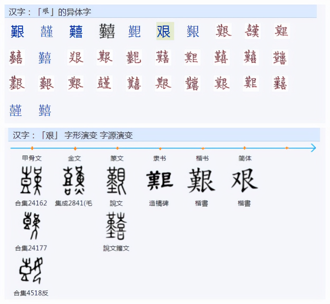 异体字“艱”简化为“艰”是根据古人(异体字、同旁字)书法省笔规范简化。