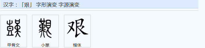《说文解字》:“艱、土难治也。从堇、艮声。”。