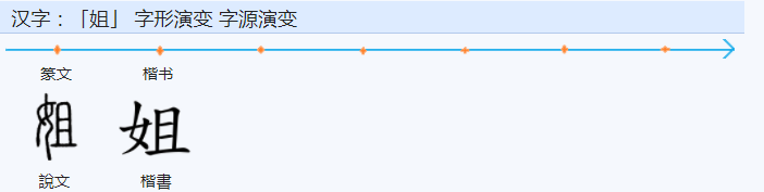《说文解字》:“姐,蜀谓母曰姐,淮南谓之社。从女、且声。”。