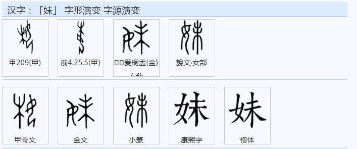 《说文解字》:“妹,女弟也。从女、未声。”。