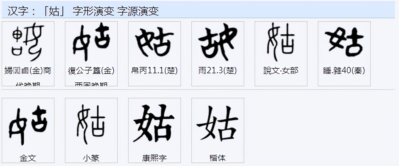 《说文解字》:“姑,夫母也。从女、古声。”。