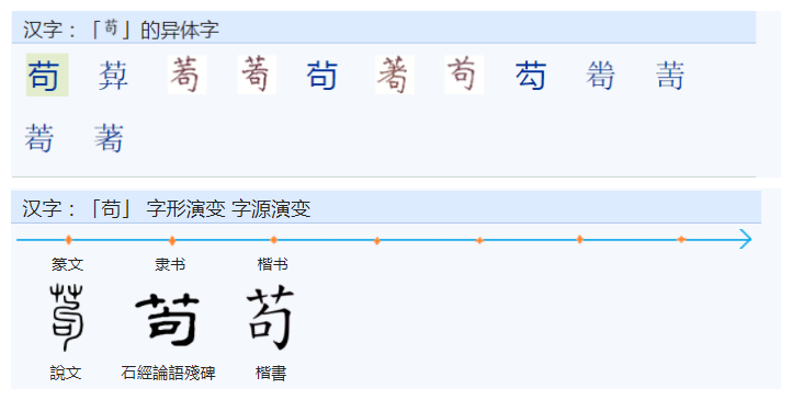 《说文解字》:“苟,艸也。从艸、句声。”。