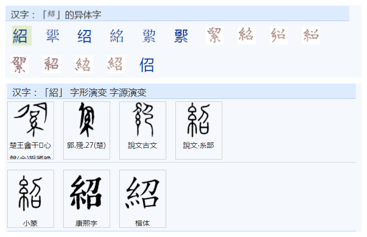 《说文解字》:“紹,继也。从糸、召声。一曰紹,紧纠也。”。
