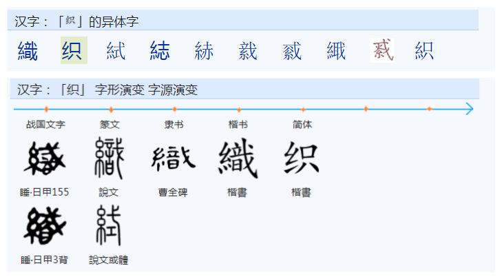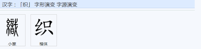 《说文解字》:“織,作布帛之总名也。从糸、戠声。”。