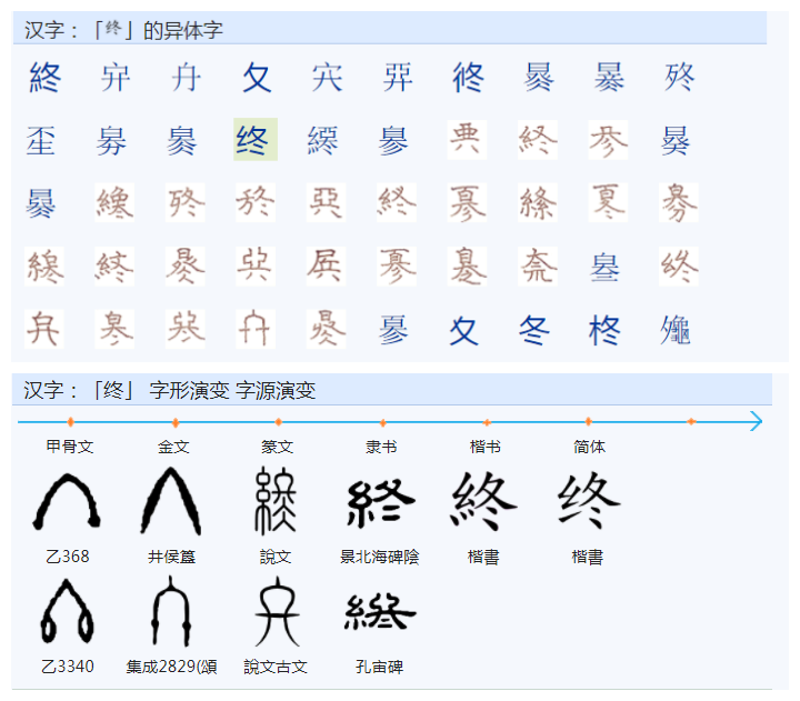 《说文解字》:“終, 絿丝也。从糸、冬声。”。