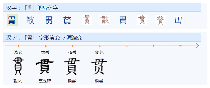 《说文解字》:“貫,钱貝之貫。从毌、貝。”。