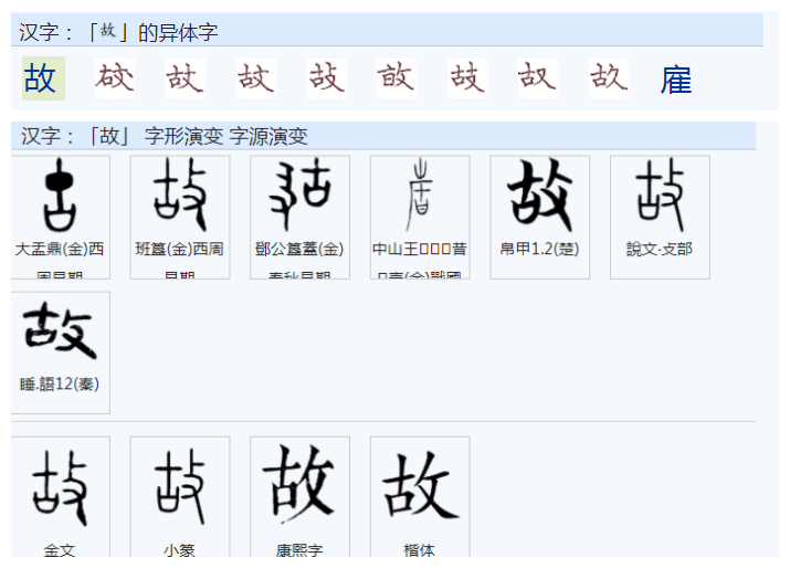 《说文解字》:“故,使为之也。从攴、古声。”。