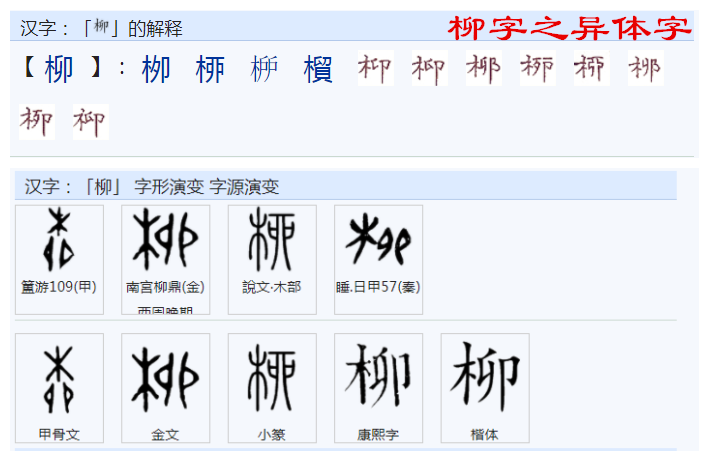《说文解字》:“柳,小杨也。从木、戼声。戼,古文酉。”