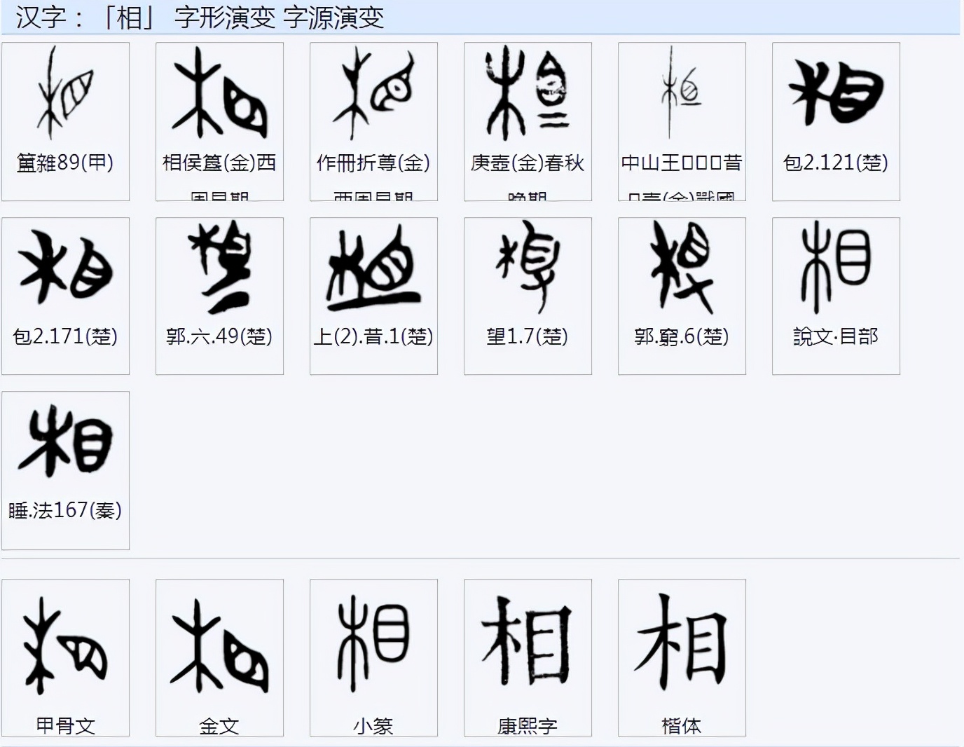 《说文解字》:“相,省视也。从目、从木。《易》曰:‘地可观者,莫可观于木。’。《诗》曰:‘相鼠有皮。’。”。