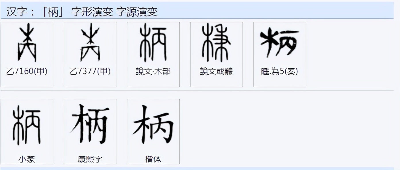 《说文解字》:“柄,柯也。从木、丙声。棅,或从秉。”。