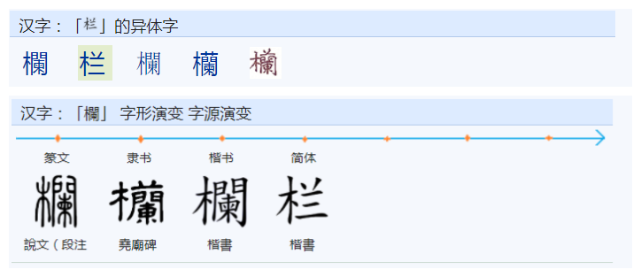 繁体字“欄”简化为“栏”是根据古人(异体字、同旁字)书法省笔规范简化。