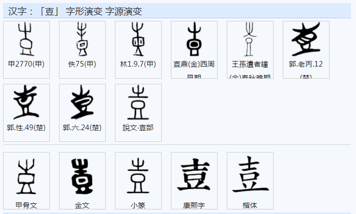 《说文解字》:“壴,陈乐立而上见也。从屮、从豆。”。