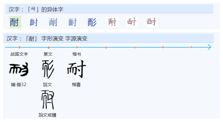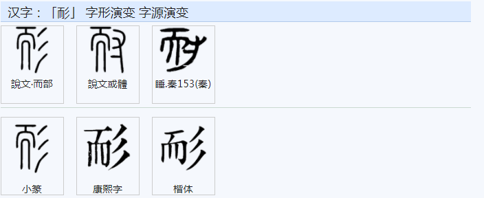 《说文解字》:“耏,罪不至髡也。从而、从彡。耐,或从寸。諸法度字从寸。”。