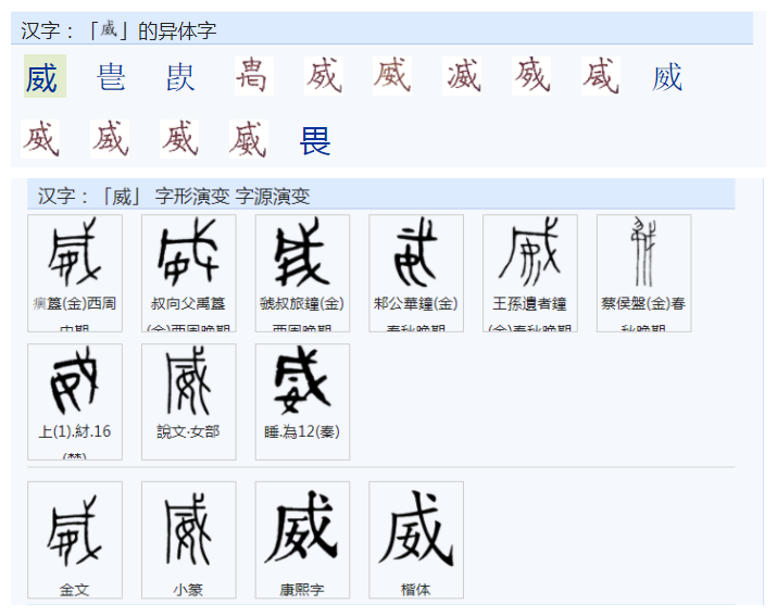 《说文解字》:“威,姑也。从女、从戌。汉律曰:‘妇告威姑。’。”。