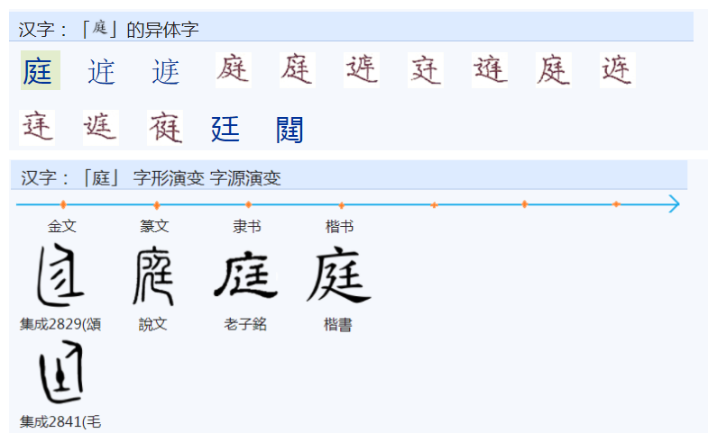 《说文解字》:“庭,宮中也。从广、廷声。”。