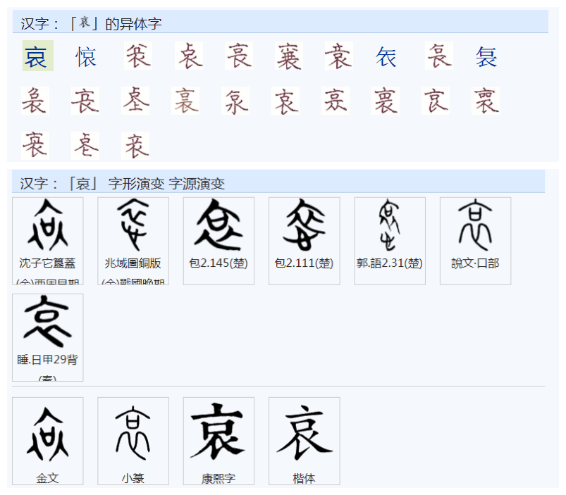《说文解字》:“哀、闵也。从口、衣声。”。