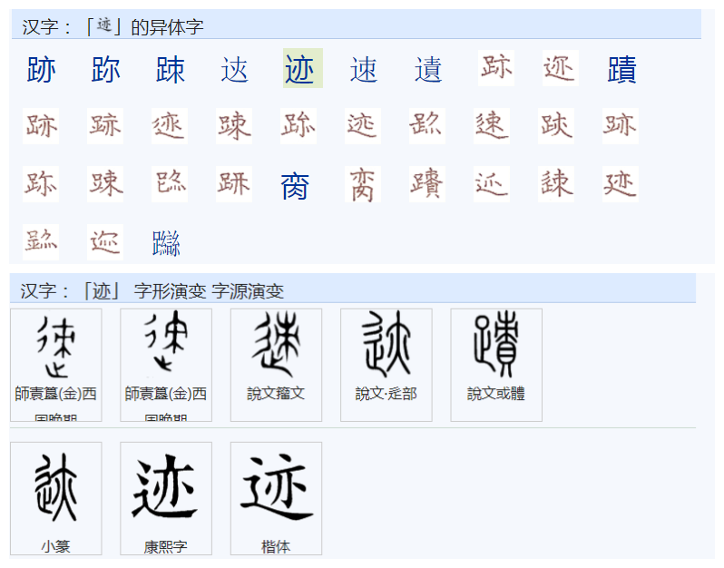 《说文解字》:“迹,步处也。从辵、亦声。蹟,或从足责。”。